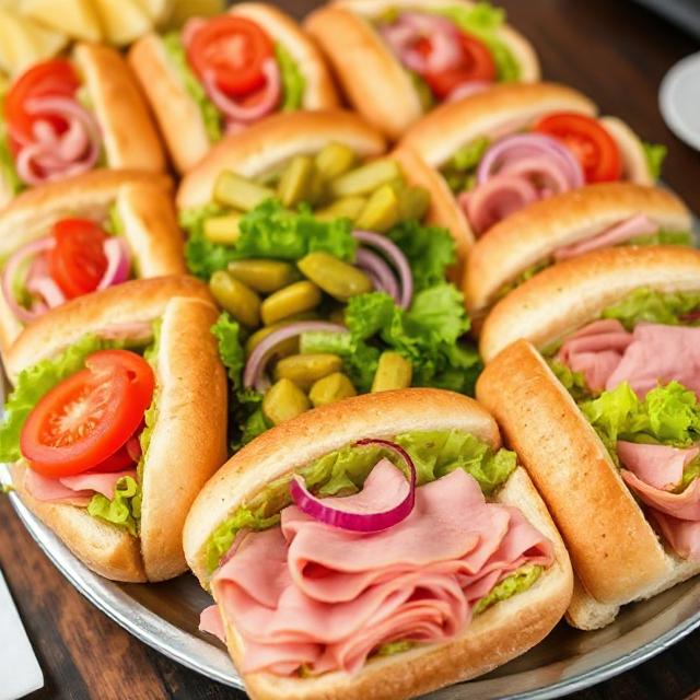 (Serves 20) A generous platter of sliced ham on fresh hoagie rolls with tomato, red onion, and crisp lettuce. Pickles served on the side, with mustard and mayo packets, bags of chip included. Can also be made into wraps upon request—perfect for sharing. Serves 20.