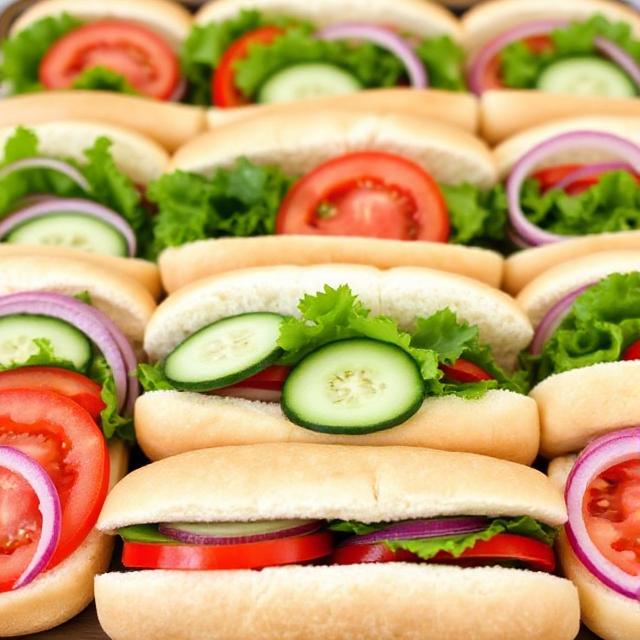 (Serves 20) Fresh cucumber, tomato, crisp lettuce, and red onion on a soft hoagie roll. Pickles served on the side, with mustard and mayo packets, bags of chips included. Can also be made into a wrap upon request. Serves 20.